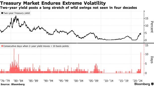 对经济前景和美联储政策路径不断变化的看法令美债经历几乎前所未有的动荡。截至周两年期美债收益率连续第11个交易日波动超过10个基点,为1981年以来最剧烈的波动。在这11个交易日中,该收益率有7天是上涨、4天是下跌的,这令多头和空头都感到痛苦。