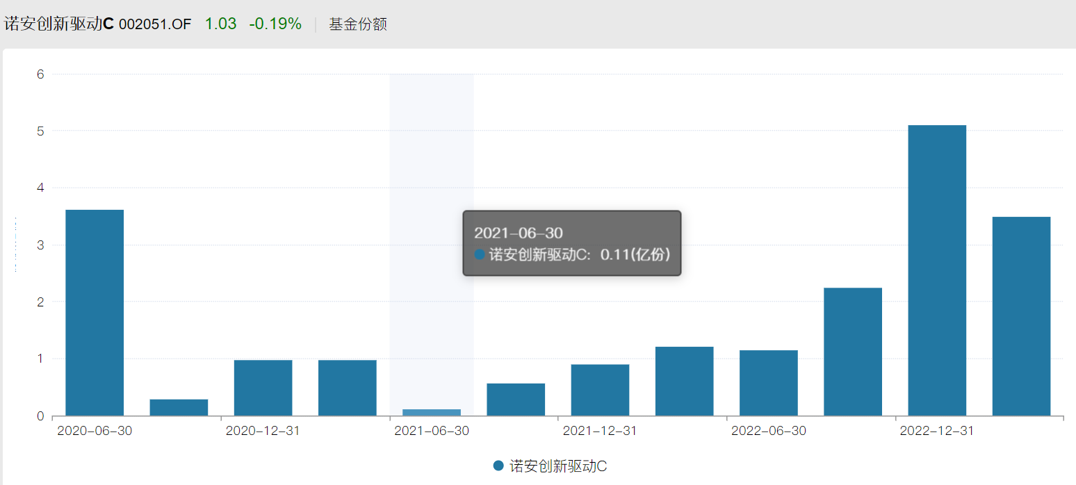 作为蔡嵩松真正成名之后接手的首支产品,整整两年前的2021年5月22日,蔡嵩松从吴博俊手中接过诺安创新驱动,彼时的这只成立于2015年牛市巅峰的产品存续管理规模已在清盘线附近徘徊,截止2021年6月底,A/C类份额合计管理规模仅0.63亿元,处于基金成立以来的最低谷,距离5千万元的清盘线也仅一步之遥。